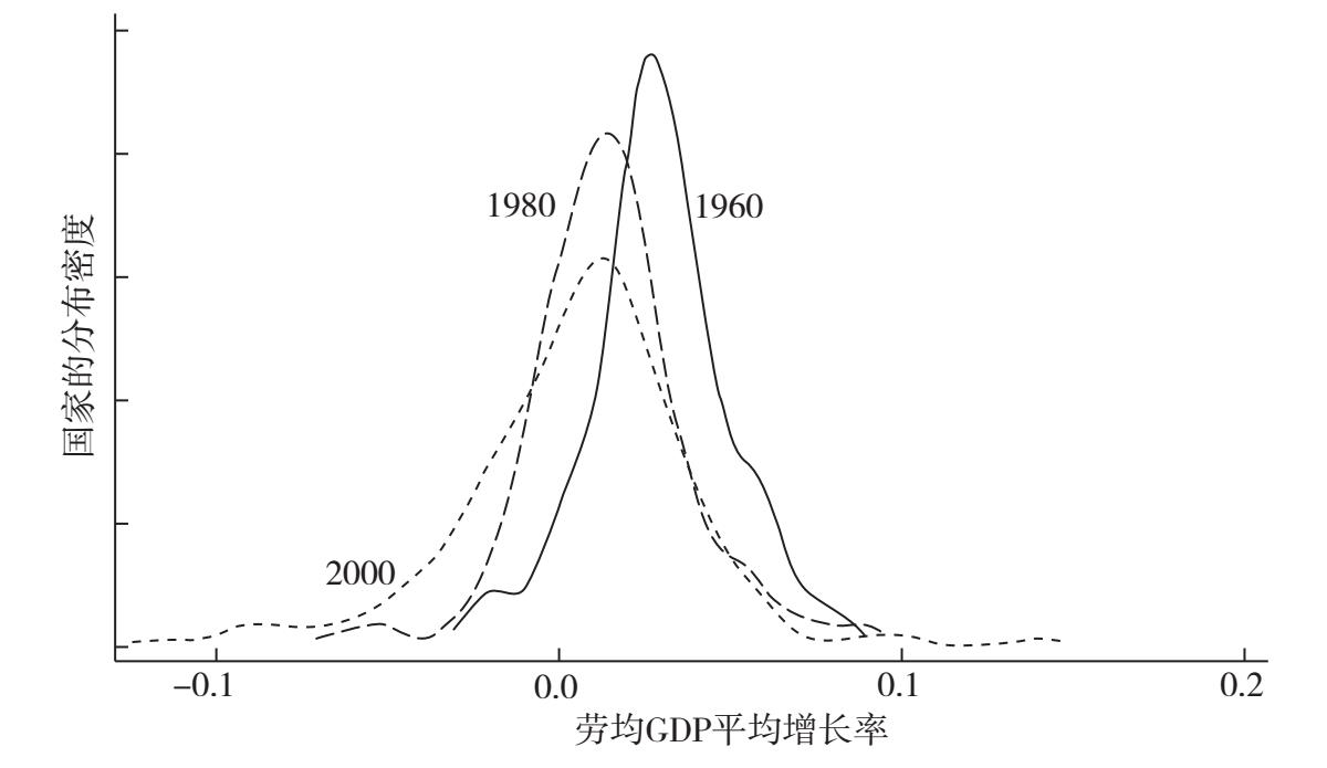 图1.7 1960年、1980年和2000年劳均GDP(经购买力平价调整)增长率的分布估计图