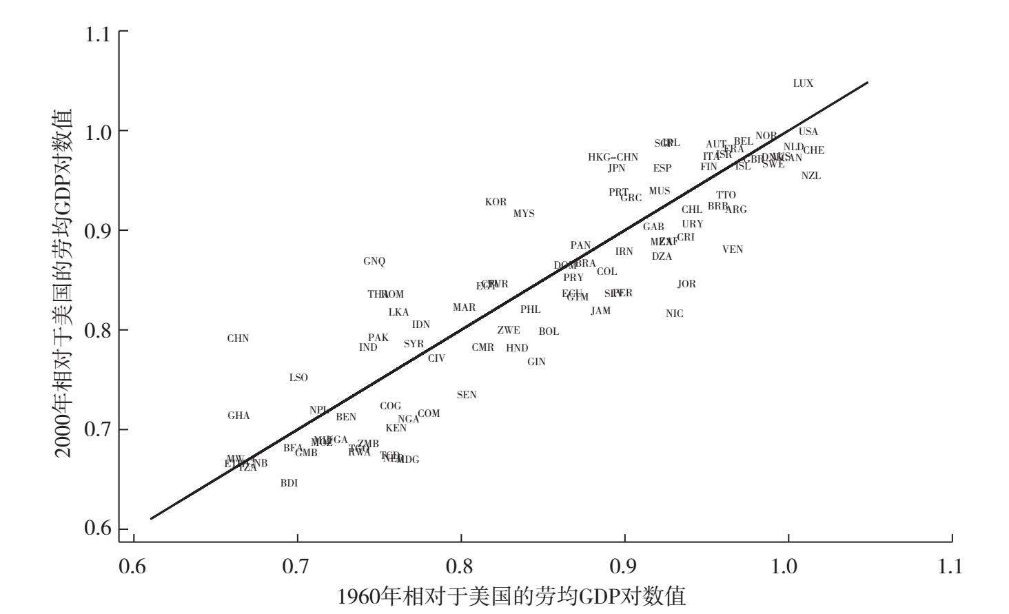 图1.9 2000年劳均GDP对数值与1960年劳均GDP对数值,以及45度线
