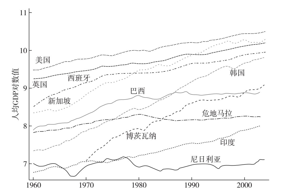 尼日利亚和印度起初与博茨瓦纳的人均收入水平接近,但是1980年之前几乎都没有什么增长。从1980年开始,印度开始经历较快的增长,但是这一增长还不足以使其人均收入赶上图中其他国家的水平。最后,和大多数撒哈拉以南非洲国家一样不幸的是,尼日利亚从1960年开始人均GDP经历了负增长,以致其在2000年比1960年还要贫穷。