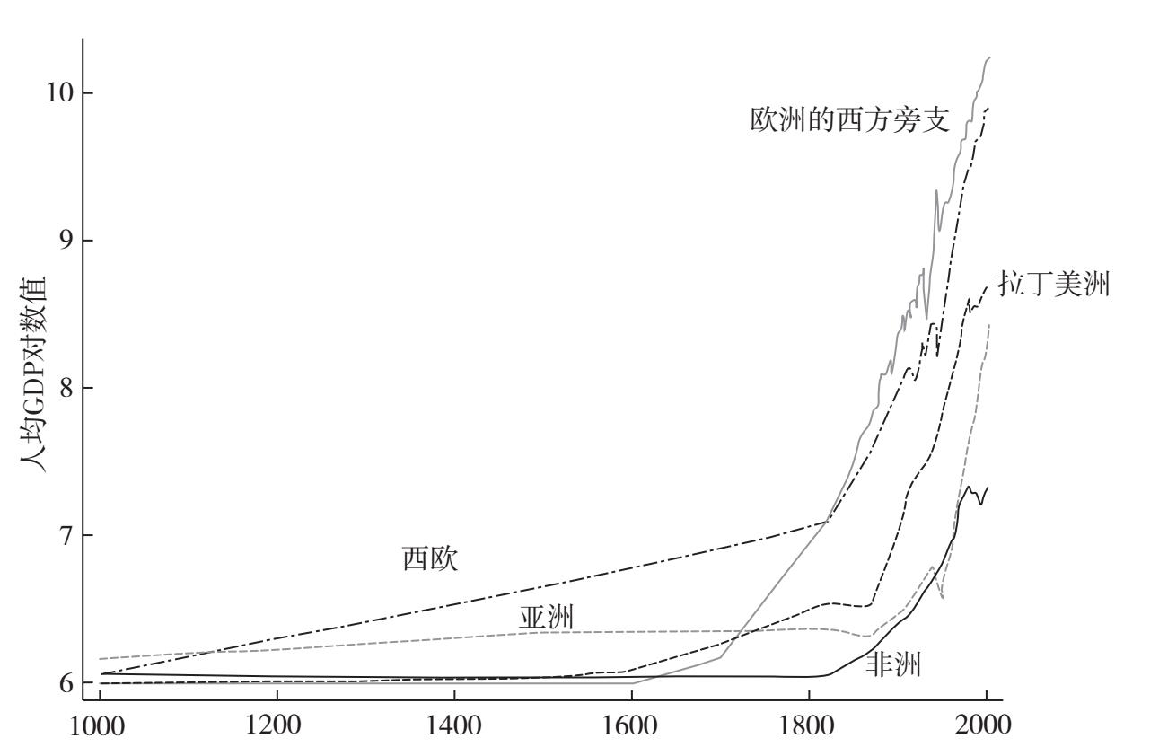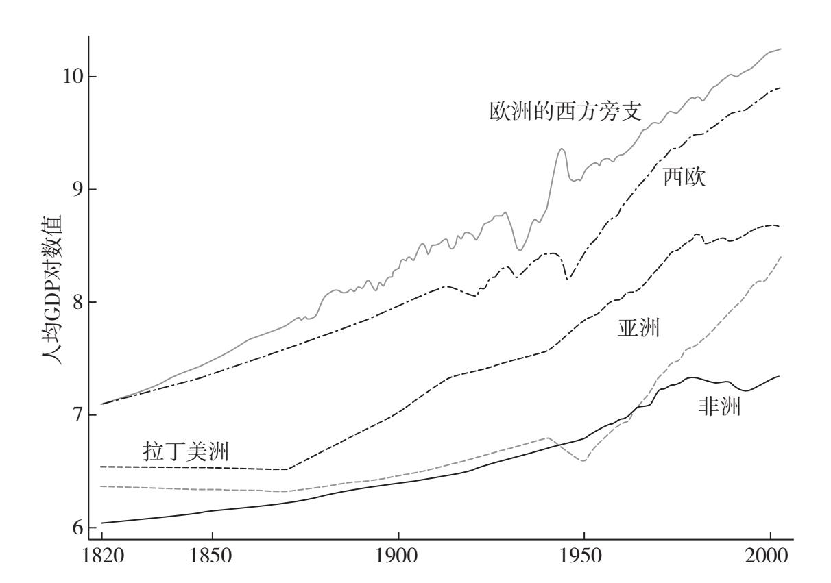 图1.10 1820—2000年欧洲的西方旁支、西欧、拉丁美洲、亚洲和非洲人均GDP平均值的演变