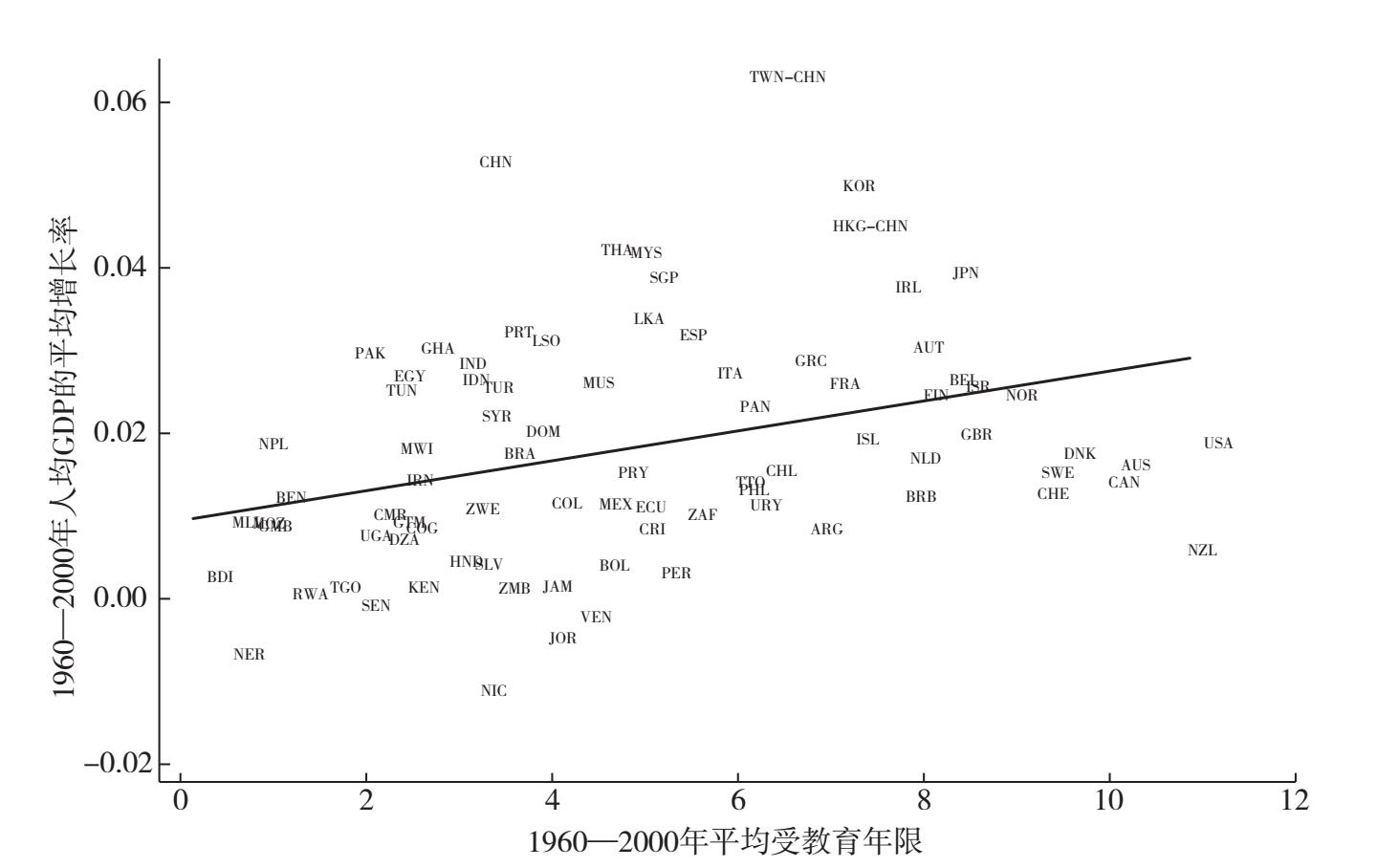 图1.16 1960—2000年各国和地区人均GDP平均增长率与平均受教育年限之间的关系