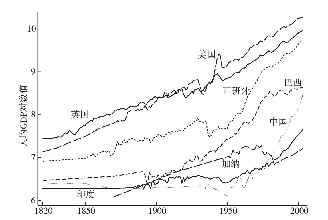 图1.12 1820—2000年美国、英国、西班牙、巴西、中国、印度和加纳的人均收入演变