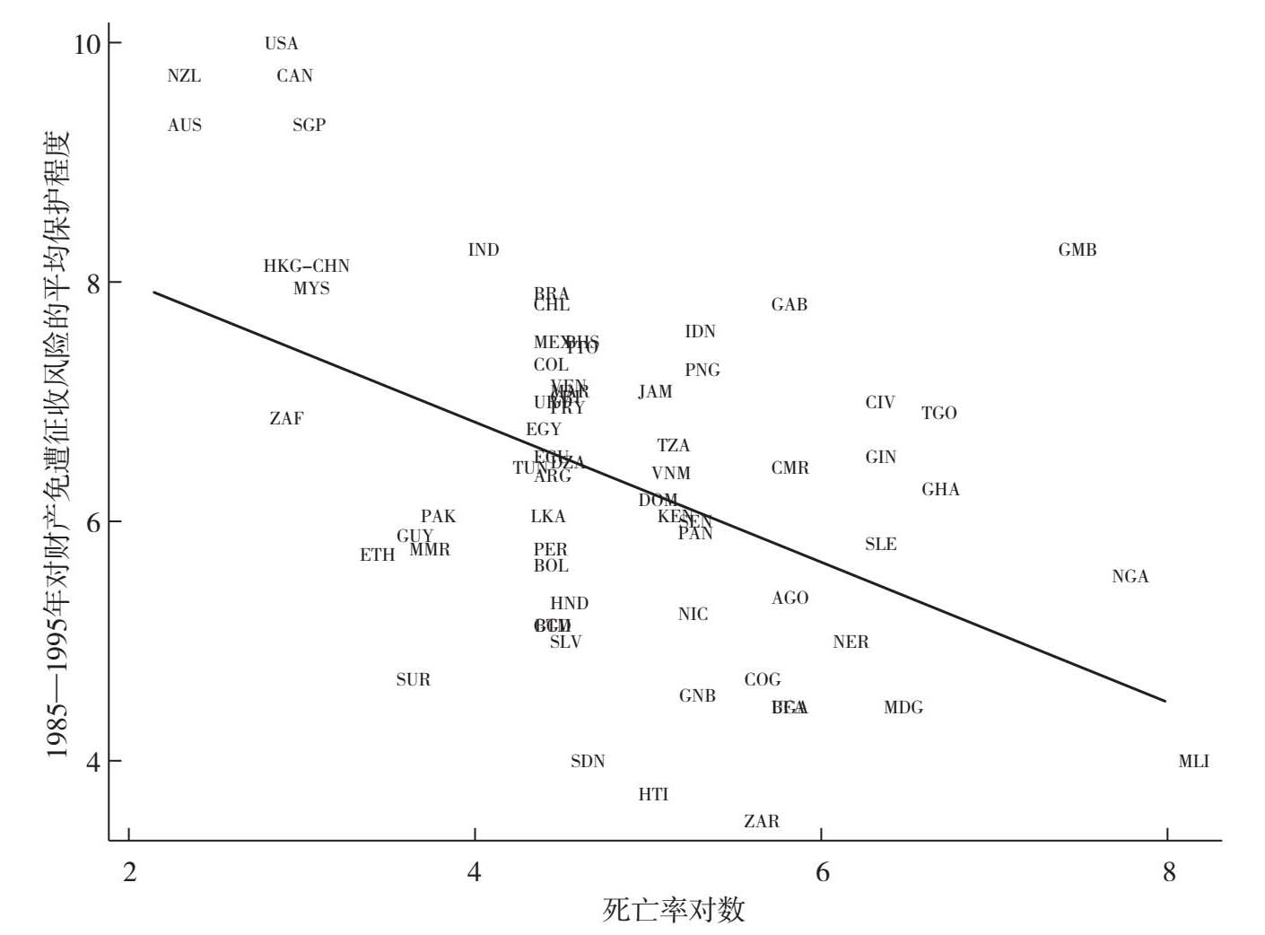 图4.1显示了各国1995年人均GDP对数与产权制度之间的相关性,其中产权制度以1985—1995年保护公民免遭征收风险的平均值衡量。测算经济制度的数据来自政治风险服务集团(Political Risk Services),这是一家评估外商投资在不同国家面临没收风险的私人企业。这些数据并不完美,反映的是一些分析师对产权安全性的主观评估,然而对我们的研究目的还是有帮助的。第一,它们强调产权保障,这是经济制度的本质方面,尤其是考虑到产权对经济激励的影响时。第二,那些打算在被评估国家进行投资的商人购买了这些测算数据,因此反映了产权保护的市场评估。