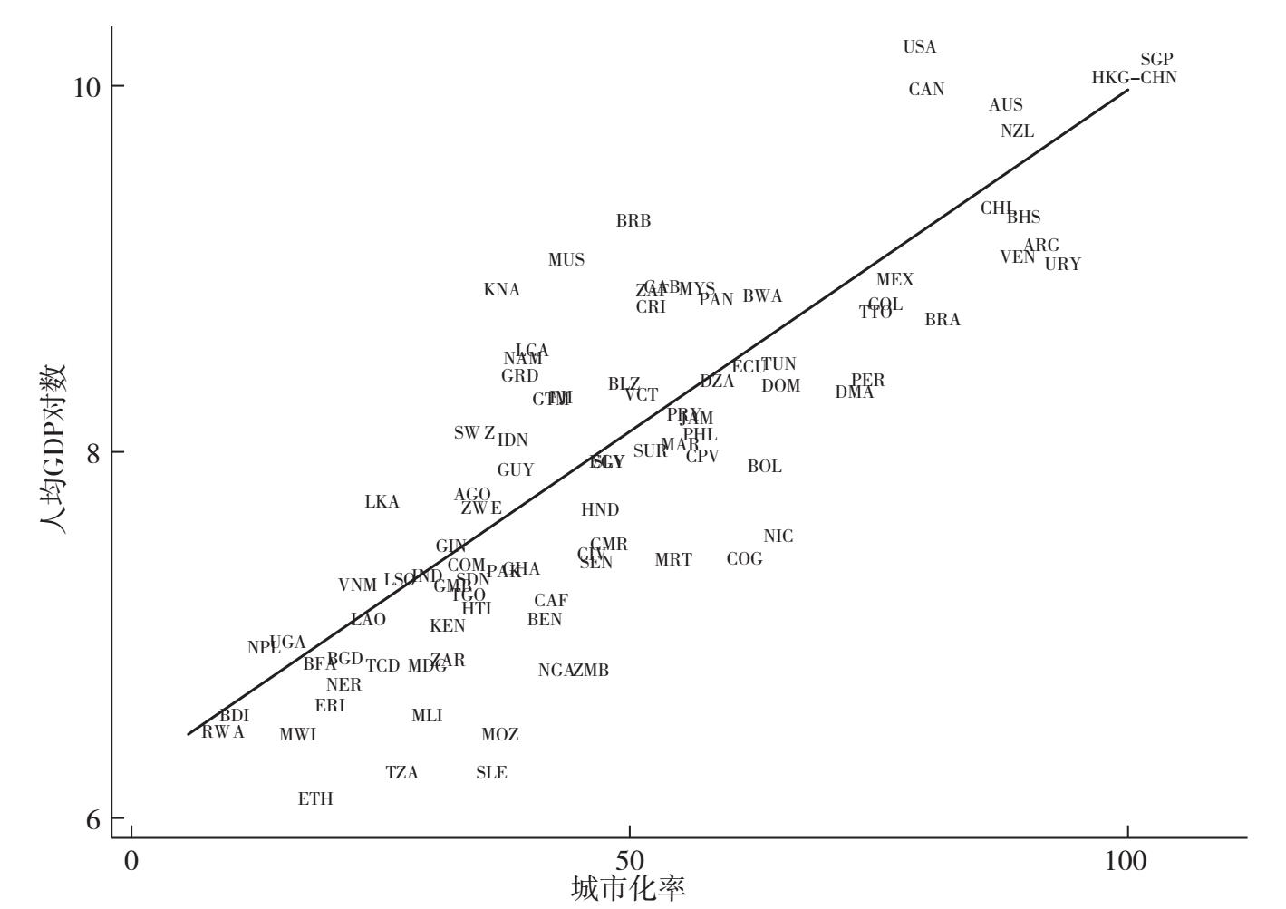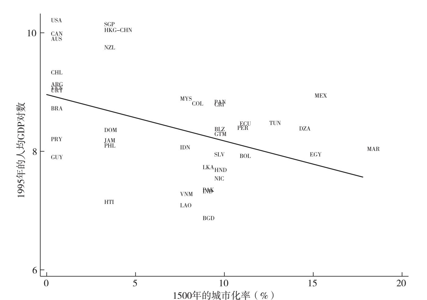 命运逆转并不局限于这些比较。为了更一般地证明这一逆转,我们需要一个500年前经济繁荣的代理变量。幸运的是,城市化率和人口密度可以充当这类代理变量。只有具备一定水平的农业生产率以及比较发达的运输和商业体系的社会,才可以支撑庞大的城市中心和密集人口。图4.3显示了1995年的人均收入和城市化水平(市中心居民人数5 000人以上的城市人口数占总人口数的比例)之间的关系。该图表明,即使在早已完成工业化的今天,城市化和经济繁荣之间依然存在显著的关系。