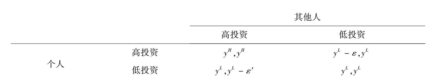 显而易见,在这个博弈中有两个(纯策略)对称均衡。其中一个均衡是个人预期其他所有行为人会选择高投资,他也选择高投资。由于同样的算法适用于每个行为人,因此,每个个体会预期其他人进行高投资因此自己也选择高投资。这就证实了所有人选择高投资是一个均衡。类似地,当个人预期其他人都选择低投资,对他来说低投资就是一个最好的选择,所以,还存在一个低投资均衡。因此,这个简单的博弈出现了两个对称的(纯策略)均衡。