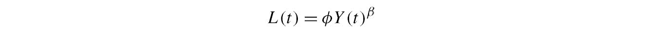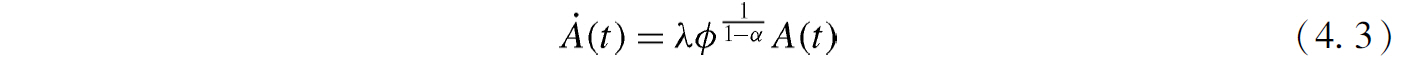 其中, α ∈(0,1), Y ( t )是世界总产出, A ( t )代表世界技术存量, L ( t )表示世界总人口, Z 代表某些其他固定生产要素(例如土地)。我们不失一般性地把 Z 标准化为1。假设时间是连续的,新的创意以概率λ出现,从而社会的知识储量按照以下微分方程演化