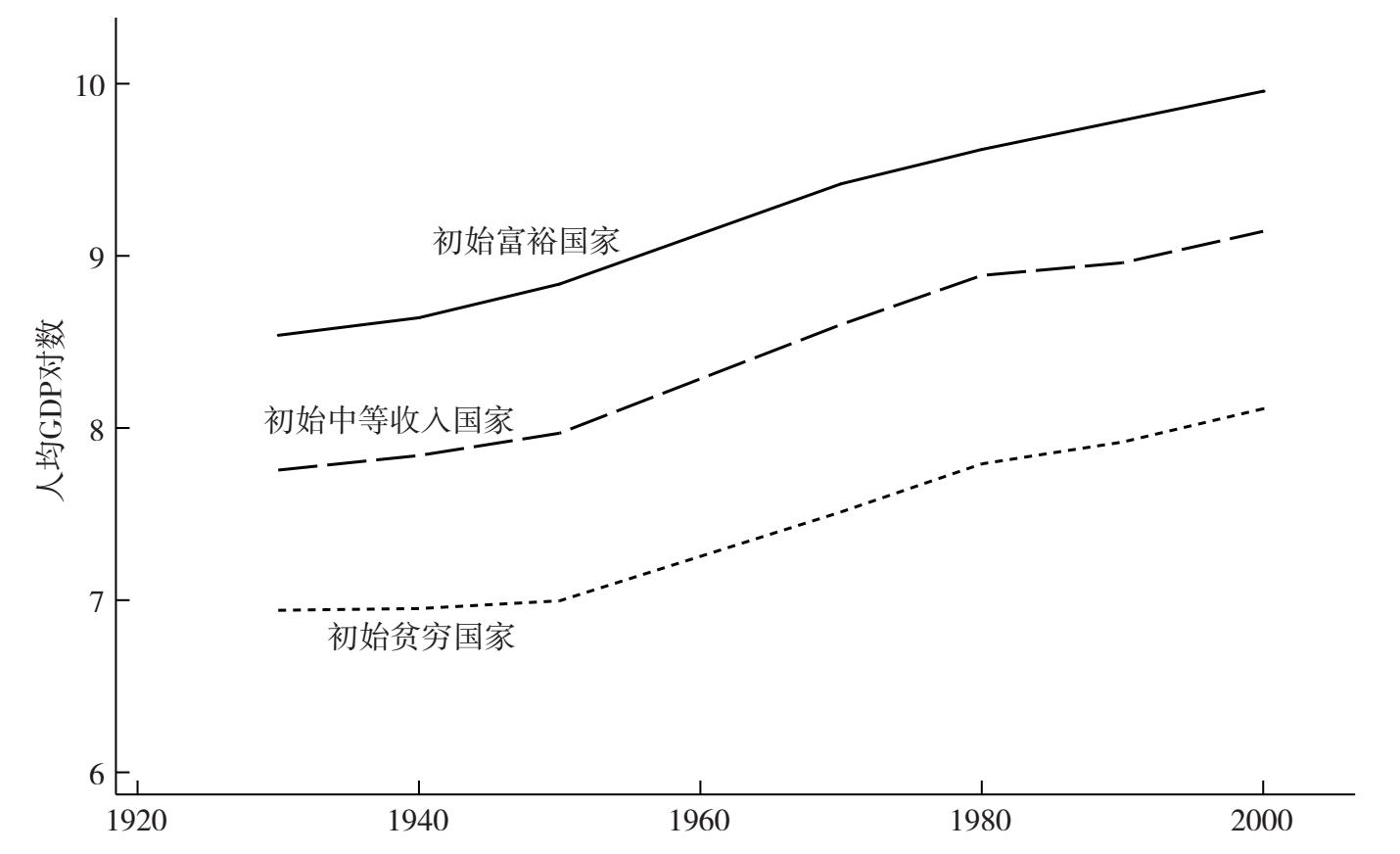 图4.11 初始贫穷国家、中等收入国家和富裕国家的人均GDP演化:1940—2000年
