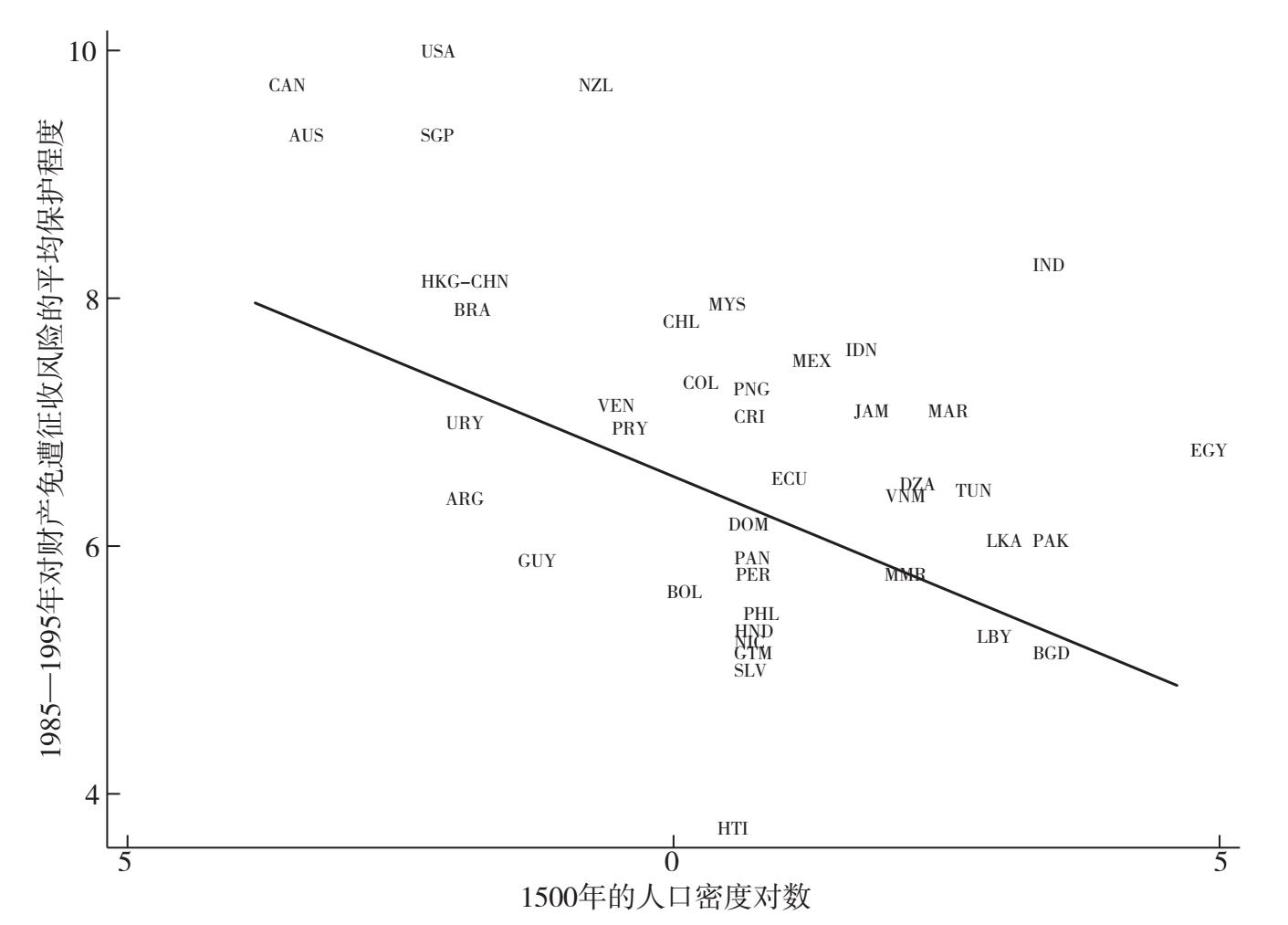 如前面脚注讨论的,欧洲人可能并没有积极引入不利于这些地方经济进步的制度,只是继承了本土文明的制度。莫卧儿、阿兹特克、印加帝国的社会结构已经是等级森严、少数精英统治下的中央集权。这些帝国的统治,就是压榨大多数人的资源以满足少数精英的利益。欧洲人通常只是简单接管这些现存的制度。在任何情况下都很重要的一点是,在高密度居住区和相对发达的地区,欧洲人出于自身的利益,建立起有利于榨取当地资源的制度,而没有尊重大多数民众的财产权利。相反,在低人口密度的地区,符合他们利益的做法则是建立保护财产权利的制度。这些激励导致了制度逆转。