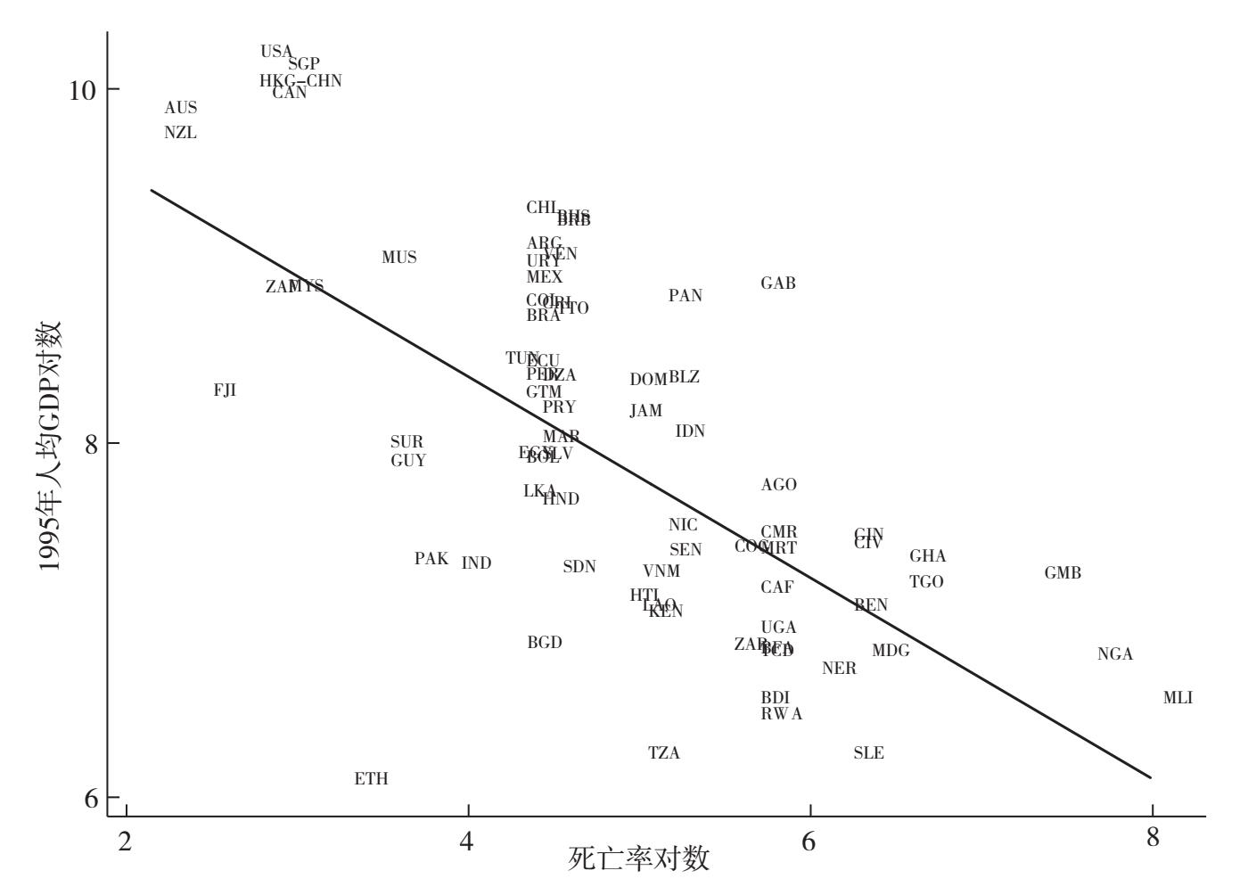 图4.9 欧洲殖民者的潜在死亡率与1995年人均收入的关系