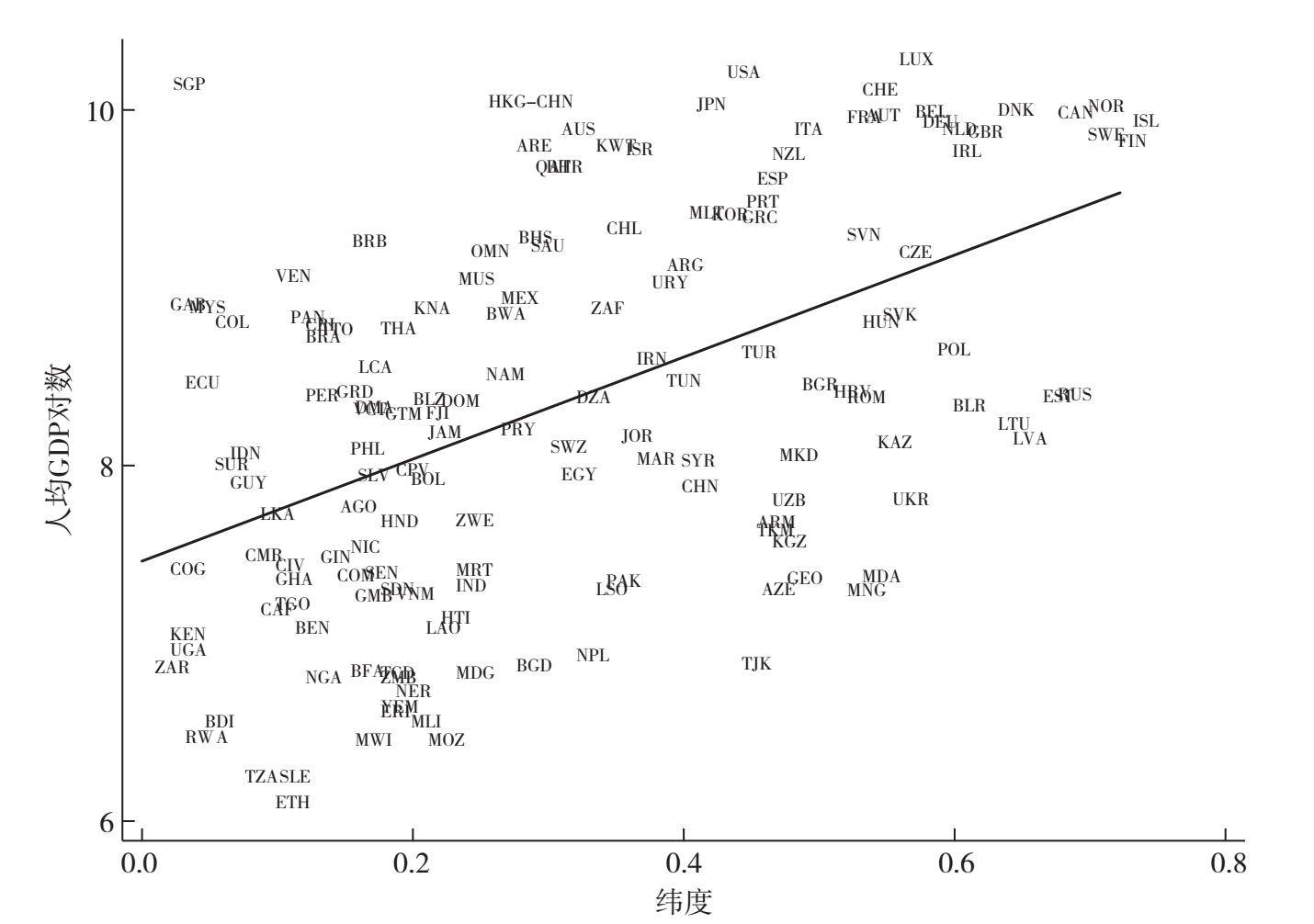 这些结论还为如下问题提供了一个解释,即为什么图4.2显示在纬度和人均收入之间存在明显的相关性。纬度和欧洲殖民策略的决定因素之间的关联可以解释这一相关性。在殖民地时期,欧洲人对热带疾病没有抵抗力,因而在其他条件相同的情况下,定居点倾向于建在温带地区。因此,历史上经济制度的创立和纬度相关。如果不考虑经济制度的作用,人们就可能错误地认为纬度和人均收入之间存在相关关系。然而一旦考虑到经济制度的影响,这一关系即消失,地理因素对今天的经济繁荣似乎没有因果作用。
