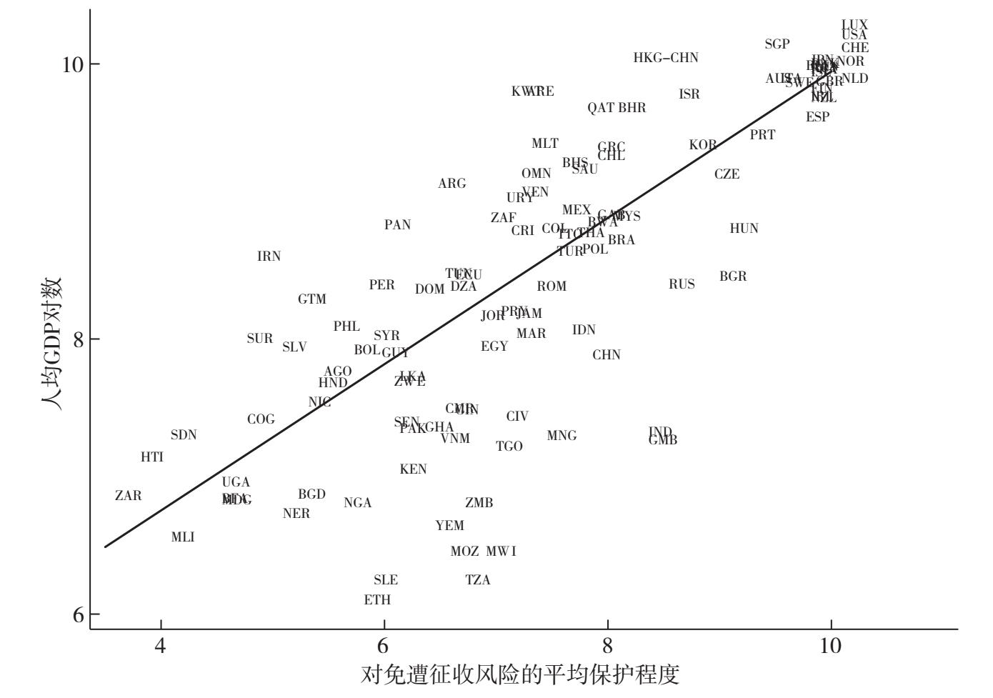 图4.1 经济制度(以1985—1995年平均被征收风险衡量)与人均GDP之间的关系