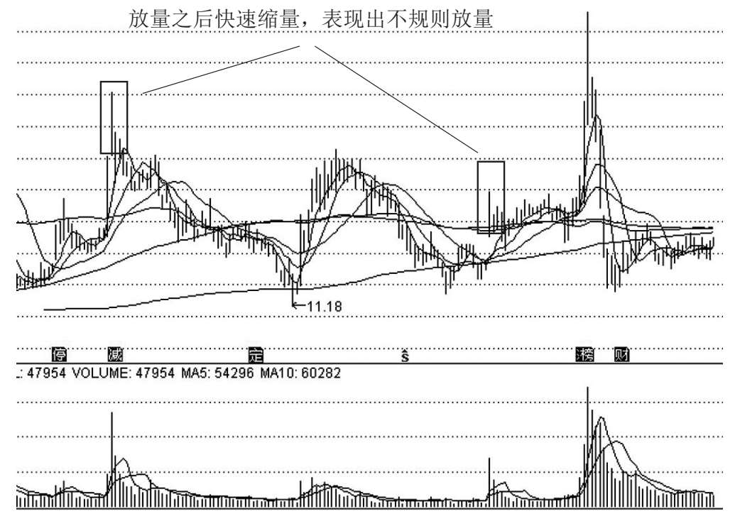规则放量是有利于我们去分析的,而不规则放量往往意味着有额外的控制力量参与到这个标的里。如果一只个股时常出现这种不规则放量,就说明这种额外的力量经常对这只个股产生影响。也就是说,这只个股是庄股的可能性特别大。这也就是为什么前面我们说这种不规则放量时常出现在庄股中。