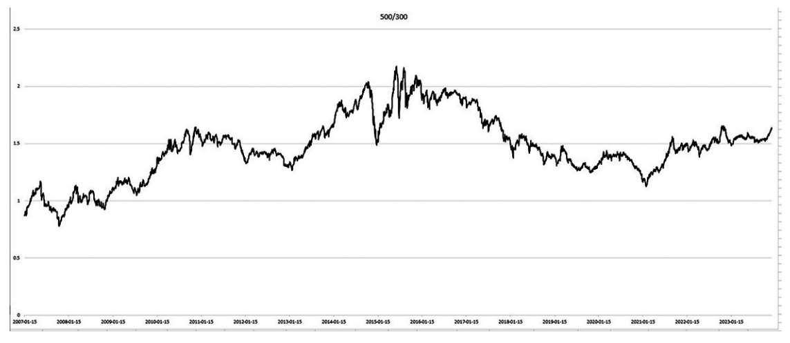 如果情形更复杂一点,同时有两个标的,一个涨了15%,另一个涨了12%,哪个更强呢?直接用涨跌幅度去判断,是不够直观的。所以,这里要有一个比价的概念。用两个标的价格波动的K线收盘价去做比价,然后把比价图画出来,强弱变化一目了然。比较长期的强弱,这种方法更好用。图1-3-7就是中证500与沪深300的比价图,这样的比价图可以用Excel来做,一些行情软件也有这样的功能。