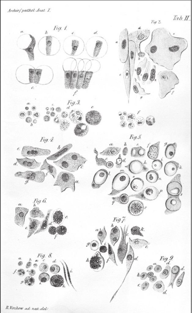 《菲尔绍档案》中的一幅插图,大约绘制于1847年,反映了细胞与组织的组织结构。注意图中“Fig.2”处多种相邻或附着的细胞类型。图中的“Fig.3f”显示了在血液中发现的各种细胞,包括具有颗粒与多核的细胞(中性粒细胞)。