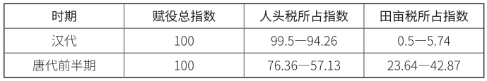 中国秦制时代的税赋(取其广义,包括钱粮与劳役),皆由人头税与田亩税两大块构成。汉代的田亩税主要指田赋,人头税则包括口钱(针对未成年人)、算赋(针对成年人)、徭役与兵役四大项。唐朝前半期实行租庸调制。租指田租,每名成年男丁每年纳租税两石,庸是按人头向朝廷服劳役,调是按人头向朝廷缴纳绢绵布帛,皆属于广义的人头税。学者高树林以粮价折算的方式,测算过汉代与唐代前半期百姓每户每年的田亩税和人头税的比例。他的结论是:在汉代,人头税占到了百姓负担的九成以上,田亩税只占了不到一成。在唐代前半期的租庸调时代,人头税占到了百姓负担的约六到七成,仍远大于田亩税。具体数据见下表: