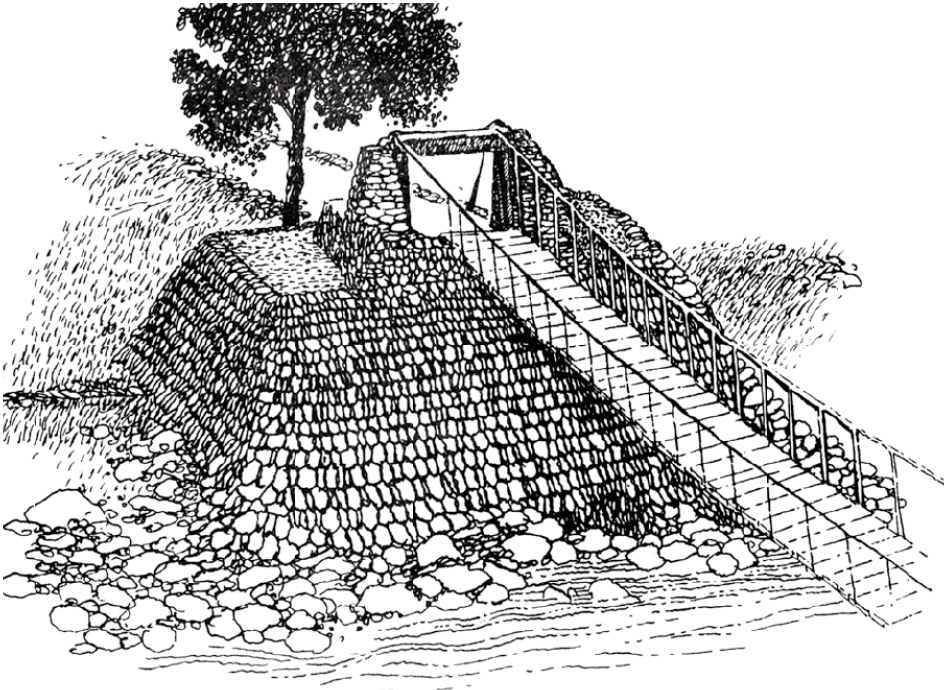 索桥,是在溜索(笮桥)原理上的发展和改造。在桥头砌石为洞门,再把几根或十几根胳膊粗的竹绳并列,两头系在桥头的石柱或木柱上,并列之索上铺设木板。岷江上游及各支流索桥“至少距今1400年以前,即已存在了”(《羌族史》)。