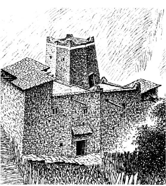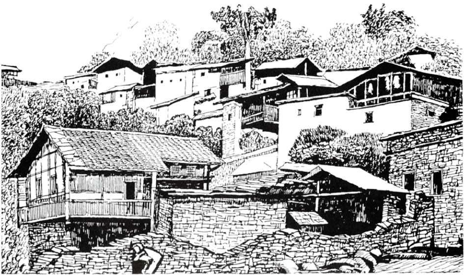 石砌住宅为占羌族住宅比例较大者,任何典籍对羌民居的描述都无法回避。它的形制很容易和碉房混淆,却是羌民居最原始的形态。它没有碉楼的附着空间,全石砌四围,即上述之“邛笼”。“高二三丈者谓之邛笼”,又“垒石为室”“依山居止”,远看如城堡碉房。所以古人原本是把10米内的羌民居和30多米的碉楼分开的,后来把邛笼和碉房统而呼之“碉房”。实则邛笼是不带碉楼的,是以居住为主、防御为次的建筑。综上三点可以列下式: