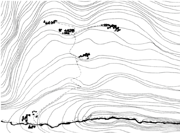 ”状地形,台地之下为陡峭斜坡,易守难攻。上有溪流水井,更是长久割据的全封闭之险境。以此对比古羌人聚落遗制,二者何其相似。