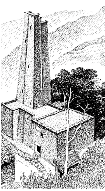 首先,岷江上游最早的羌人住宅延续并糅合了西北窑洞、帐幕、干栏三种形式。在原西北这三种形式均设有十分高耸的瞭望和战争防御的建筑设施。而在成都出土的东汉时期的牧马山画像砖上,一座大型庄园左侧出现了碉楼的原始形态—望楼,刘致平教授直呼其“碉楼”。此前200年秦灭蜀后,“在移民的同时,也修筑了城防”“造作下仓,上皆有屋,而置观楼、射栏。城上有供瞭望的‘观楼’和储放弓箭的‘射栏’”。应该说“望楼”与“观楼”在防御功能上是异曲同工的。汉武帝时司马相如出使西夷冉駹等地,后来姜维在威州附近构筑城堡碉楼,等等,这些人都极有可能把内地望楼形制带到羌区。羌区河谷多荒漠,木材少且不具坚固性,人们就地取材,以泥土或土坯砌碉楼,便造成今日威州镇周围布瓦山寨和木常寨有7座土碉楼的现状。而茂县羌族核心地区几乎清一色的石砌碉,则说明是土碉的发展,更糅合了帐幕顶内收弧线的碉楼做法,成六角、八角形貌,而上述土碉仅为正方四角状。当然这里也不排除羌人在深入内地兴修水利、筑坎打井的过程中,借鉴了汉族望楼形制而自发构筑的可能,或这本来就是羌人的创造。