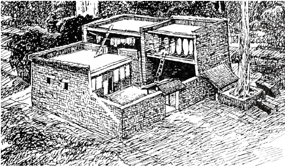 岷江上游的古羌建筑除火塘、中心柱古制外,只传承了西北帐幕古制中的一部分。因为古羌人在西北时除了游牧还从事农业生产,亦同时住窑洞。有考古学家、历史学家认为在天水一带,亦有干栏民居。所以张良皋教授认为:“今天西藏民居式样,显然是帐幕加以‘干栏化’,不过材料已是木石兼用。”若我们回到羌族住宅的底层和二层来看,真正“依山居止”者,底层和二层的后立面是无人砌墙体的,而是利用原生岩体作为墙,有的还挖有洞穴作为贮藏室、隐蔽室。正因如此,我们可以说羌宅石墙泥墙是由洞穴延伸出来的。众所周知,穴居自然会演变成窑洞,并向垝垣、版筑、土坯、石砌等发展。于是上面的羌族民居中出现了帐幕、干栏、窑洞三者兼具的古代建筑遗迹的混合体,亦即张良皋教授所言的中国建筑“三原色”。正是“三原色”经历史的碰撞、交融,才调配出“五彩斑斓的颜色”,才形成中国传统建筑体系。从现在的资料看,全国各族建筑中尚没有发现如此类型集中、成片的大规模古建筑体系。所以,我们谓羌族建筑为中华建筑的化石。从一定程度上讲,羌族建筑不仅是西南地区大部分少数民族建筑之源,也是中华建筑目前保存完好的源头遗迹。尤其是羌族民居中有一类带天井的民居,像曲谷寨、王泰昌官寨,布瓦、克枯等寨民居,原来很多学者都认为是受到汉族四合院的文化影响所致。鄙以为,既然羌民居有窑洞发展遗迹,则必然有下沉式窑洞的遗存,而四合院正是由下沉式窑洞发展而来。那么,古羌人把这一形式带来岷江上游之地亦顺之成理。亦可言羌民居带天井一类之型,亦如下沉式窑洞到四合院的过渡之型。