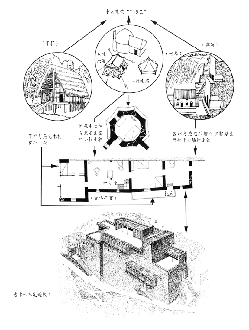 至于干栏之貌,前面张良皋教授谈了“木石兼用”的藏民居。当然,羌民居更具粗犷的原始味。于此,我们更进一步发现中国建筑“三原色”在羌族建筑中的普遍遗存。拿此观点和事实对照其他区域建筑的现状,西北窑洞有穴居的渊古,却无干栏、帐幕的遗迹;南方干栏的成熟,却找不到窑洞、帐幕的蛛丝马迹;羌系后裔西南少数民族应是最有条件传承这一古风者,终因人文和自然的因素,建筑大变。唯岷江上游的羌族自汉入驻以来尚封闭之因,又善与藏、汉族相处,并坚信本族文化,种种因素使羌人完整地将建筑“三原色”糅合在一起,自成一家,体系完备。所以,中华建筑及西南部分少数民族民居之源,活生生的例子只有在羌族地区才可一睹风采了。