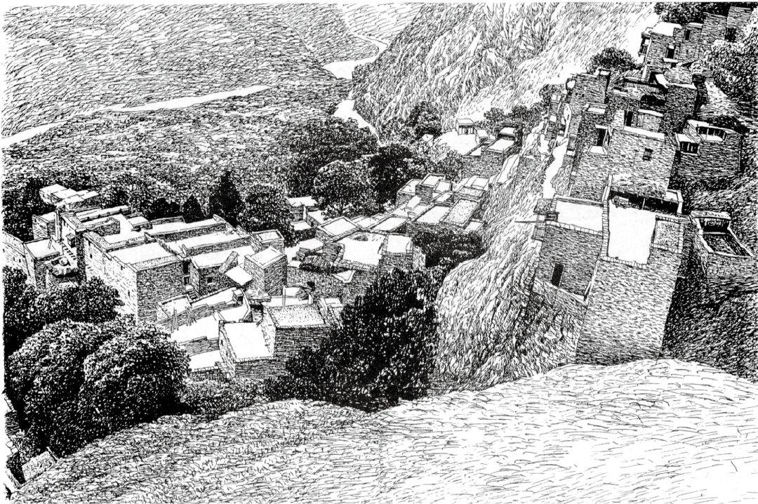每个寨子由数量不等的家庭单元组成,小则几户,多则百家,规律性极强,又形式多样。首先,主干道路多垂直于等高线,两旁有岔道支路,不少寨子在道路上搭建过街楼天桥,有大门和道路串联。道路由于两边均为两三层的住宅,故显得狭窄。此恰又利于防御,如遇敌窜进寨,困其于巷道之内以乱石檑木击之。有的寨子引水入道路一侧,多为清洗用水,不作饮用,算是道路、水路并行的长处。不足者为易毁路阶自成“阳沟”,造成有路无道的粗劣状况,这一弊端是极易改变的。另一个具有规律性的特点是寨子内每家屋顶平台相互衔接,成为“第二地面”的整体空间(亦称第五立面)。此制的形成除了有山区平地难寻、少雨寒冷等因素,防御中的屋面相互支持,应是不可怀疑的因素。