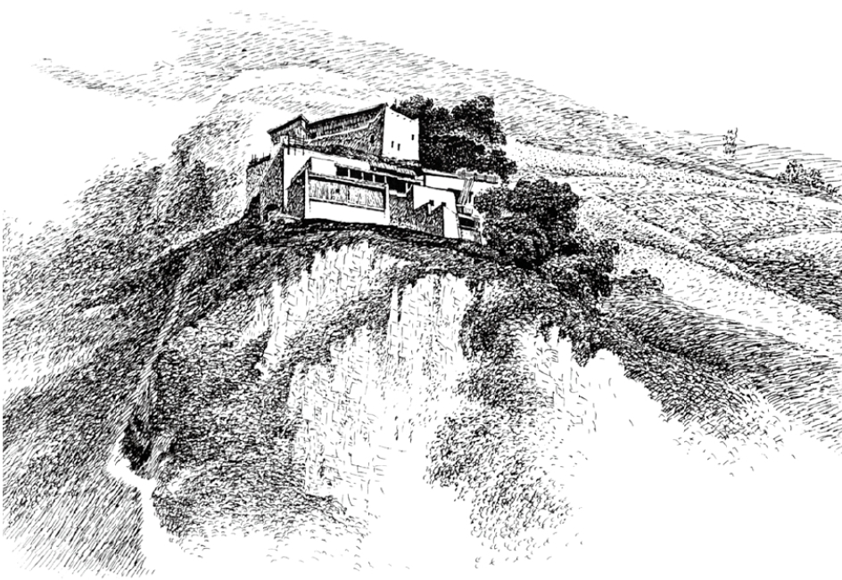 河谷两岸半山腰的台地与缓坡,是羌族村寨的又一分布带。在地形上它是和河谷村寨选址相对而言的概念,两者相差高度伸缩性很大,是河谷与高半山之间的开阔地带。羌村寨选址于此仍是由耕地因素决定的。所谓开阔地带不是平地,而是指陡坡间面积大小不同的台地。这里的“台地”往往也是倾斜的坡面,不过坡度缓和一些而已。半山腰耕地占羌族农业耕地的比重稍少,因此,村寨的分布亦较少,选址显得更加艰难奇险,是充分发挥石砌技艺的地方。根据地势及生产、生活、防御的需要,村寨或随等高线布局,或垂直于等高线布局,呈现出多种格局。因为半山羌族村寨是在住宅的顶部形成平台,构成人为的晒场,以解决生产、生活、防御之需,因此村寨选址对地形地势不做过多要求。更甚的是,过去械斗不断,着意选址悬崖之上者亦不是少数。这样的选址体现了既利于生产、生活,又利于防御的原则。比如亚米笃寨,选址于半山一凸出的悬崖上,中开一条似街道的多梯巷道,生产、生活上,各家屋顶平台相连,收获的庄稼可由山上背负直达各家屋顶。如遇犯敌,亦可压缩其于巷道之中,然后投之以檑木和石头。因此,半山腰的羌寨选址最能体现住宅的集体防御功能。