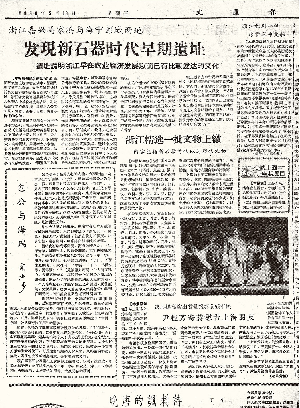 图1-3 《发现新石器时代早期遗址》,《文汇报》1959年5月13日第3版