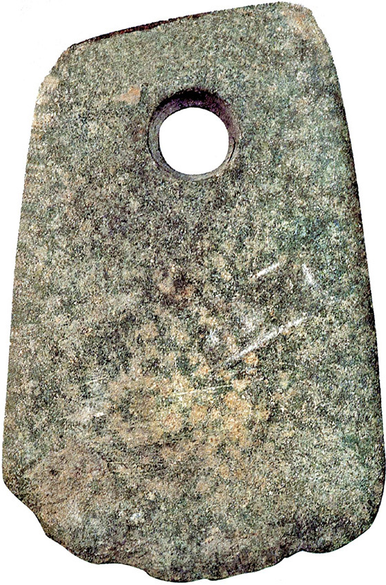 图1-5 嘉兴马家浜新石器时代遗址出土的穿孔石斧。嘉兴博物馆提供