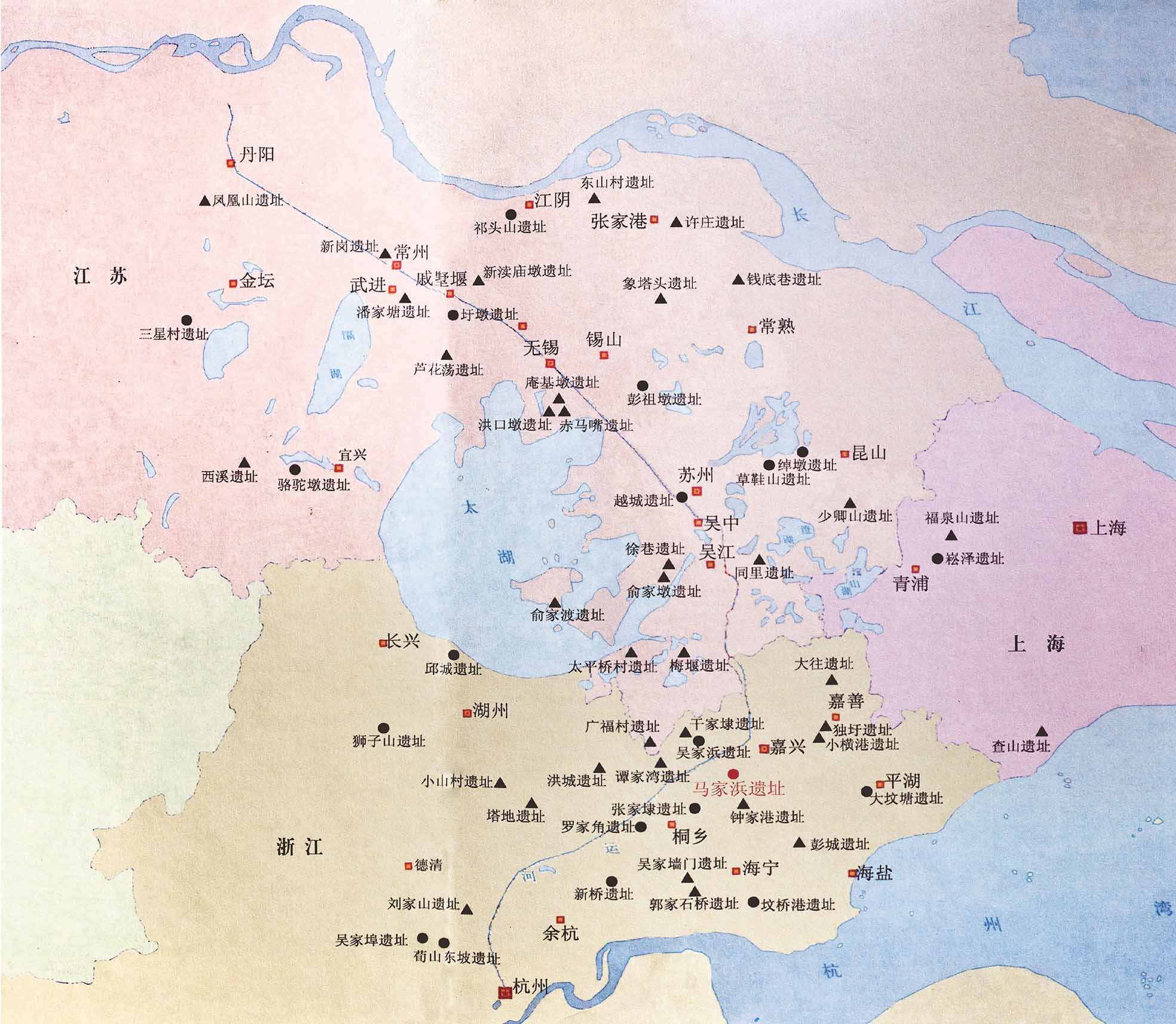 第四,关于马家浜文化的分布范围。马家浜文化主要分布在太湖地区,南达钱塘江,北濒长江,范围较广,可以说散布在整个长三角地区。各地之间的共同特征明显,但是由于分布的地域广阔,内部生态环境也存在一些差异,因此,有学者就提出可以将马家浜文化内部区细分为多个文化区。如有学者根据对各遗址典型陶器的分析,结合生产工具、房址和葬俗等因素,认为马家浜文化各遗址存在殊异,据此将马家浜文化暂分成三个不同的类型:苏南沿江地区的东山村类型、浙北地区的罗家角类型、太湖流域腹地的草鞋山类型。
