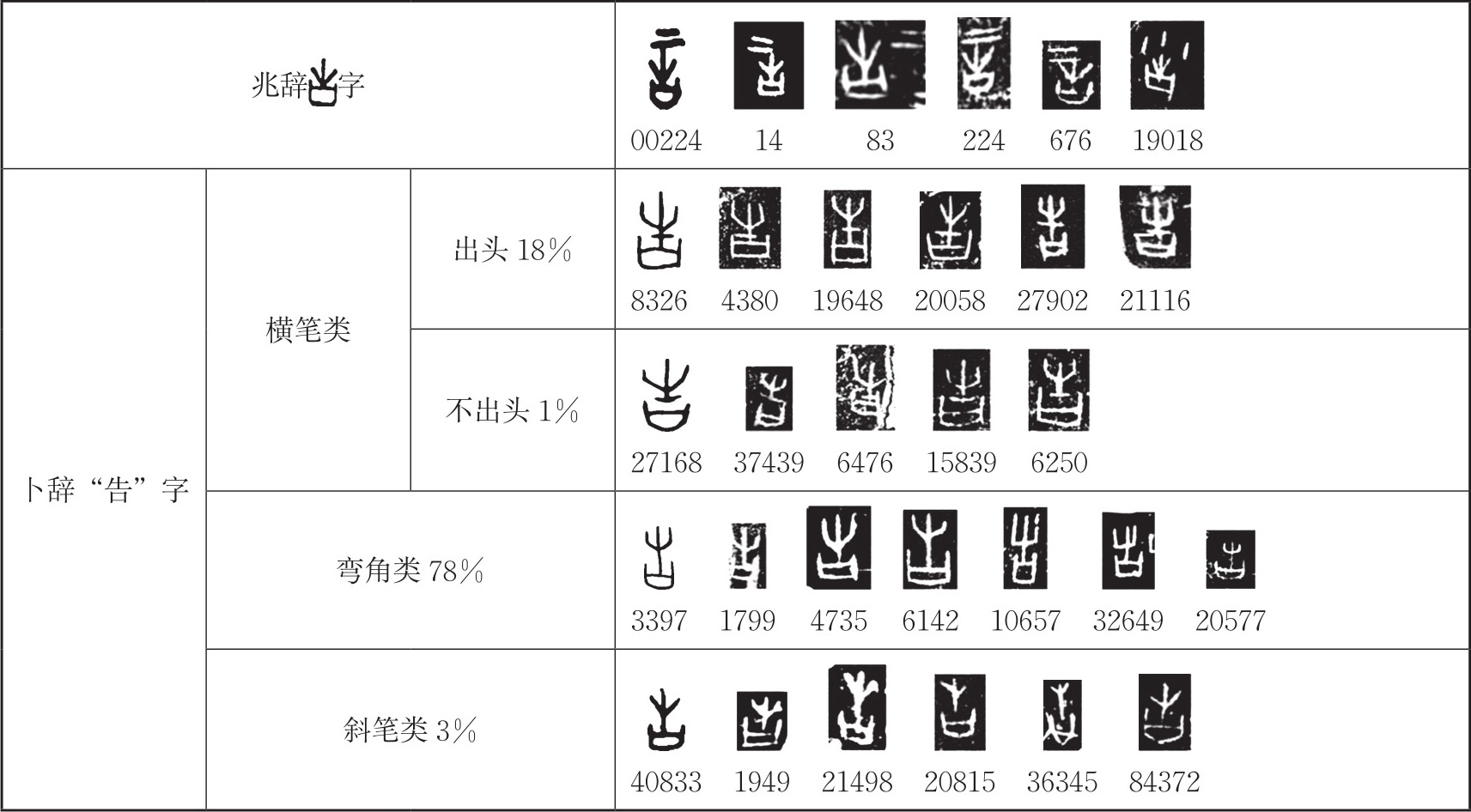 ,弯角类占比达78%,横笔类有19%,斜笔类只有3%。表二将这三类“告”字与兆辞
