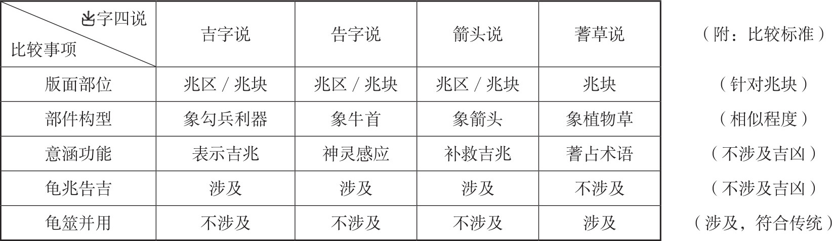 类兆辞的解读作一简明对照,列出版面部位、部件构型、意涵功能以及传世文献的“龟兆告吉”与“龟筮并用”五种事项来作比较。