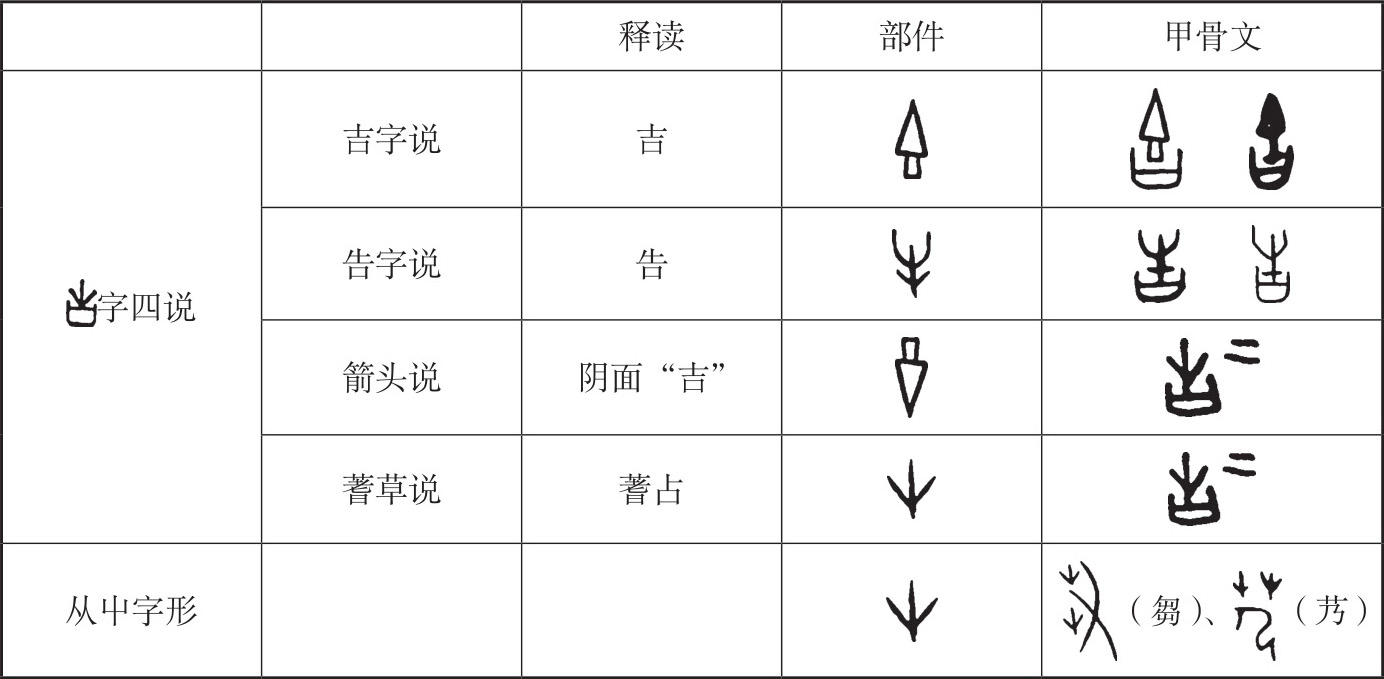 字共有四种释读:吉字说、告字说、箭头说以及蓍草说(见下文)。本文从版面部位、文字构型、占卜功能三方面综合比较这四种释读说法。版面部位:我们定义兆块与兆区,兆块是甲骨兆璺、序数、兆辞及背面钻凿的集合体,兆区是一组序数全部兆块的集合体。文字构型:我们比较