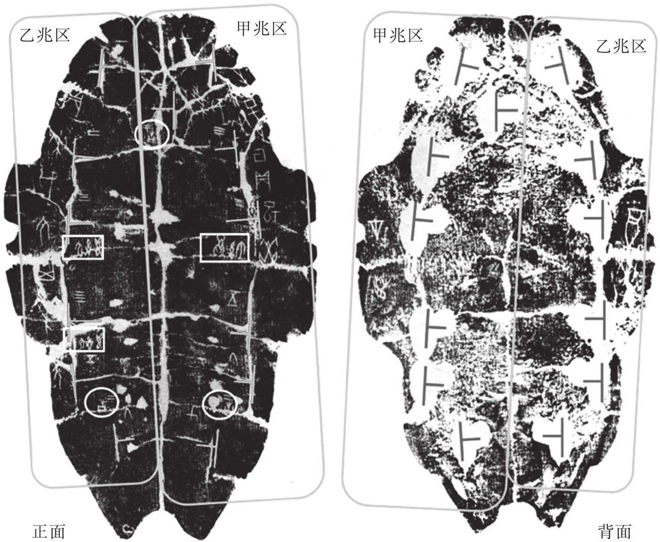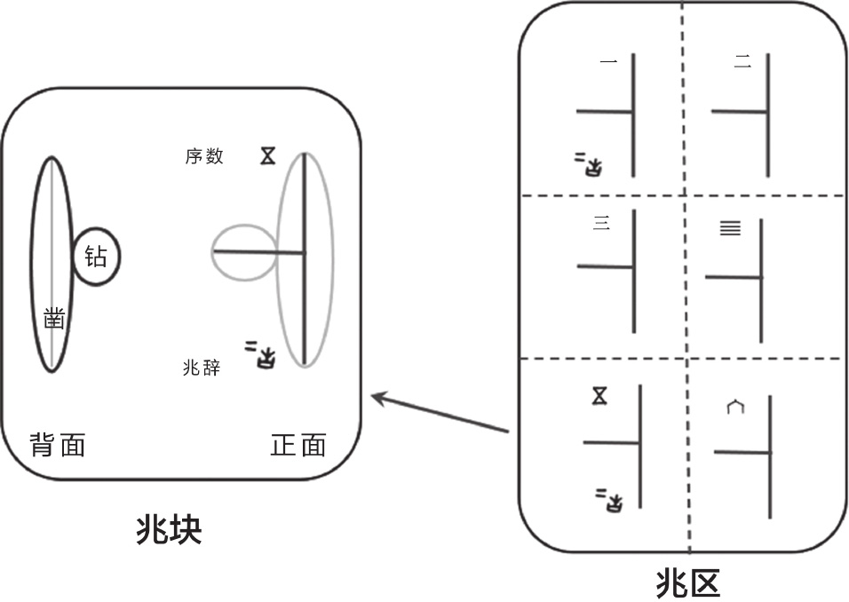 注:最外侧大框划分不同兆区;正面卜字形兆璺与背面钻凿表示兆块位置;兆辞以圆框或方框表明。