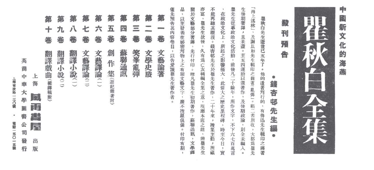 中国左翼文学和左翼文学史观的现代兴起,都是二十世纪中国革命图景的重要元素,不仅与马克思主义在中国的传播与发展密切相关,也是无数革命先驱在思想文化领域取得的战果。而倘若要数两三人代表左翼文学在中国文学思想史、文学理论史和文学批评史上的成就,则必有瞿秋白。瞿秋白不仅是中国早期马克思主义的接受者、传播者,也是中国左翼文学的倡导者、创造者和在场者。尤其在中国现代文学史观的形塑进程中,他更是促成其左翼转折的关键人物。钱杏邨1939年拟为其编十卷本全集,发刊预告中称之为“中国新文化的海燕”(图1)