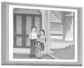 本尼盯着床边墙上挂着的一张照片发呆。他说:“看看这张旧照片!是一个小女孩还有她的家人在房子前面照的相。”