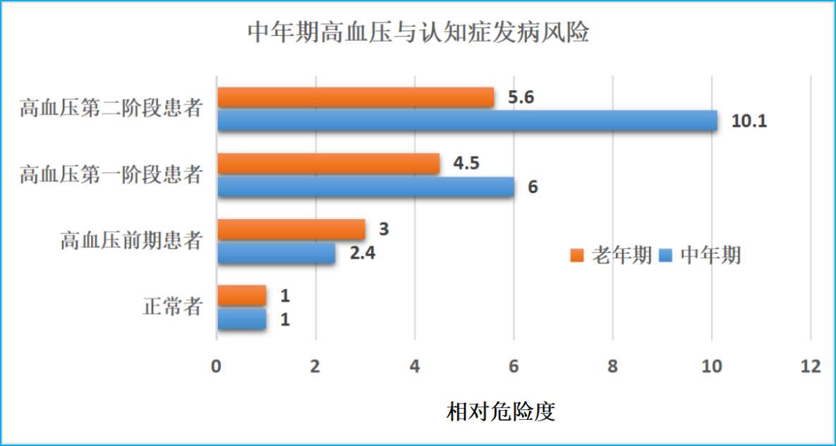 研究团队以中年期人群为研究对象,根据这个血压值的分类调查分析认知症发病概率时发现,血压正常者的血管性认知症的发病概率为1.0的话,高血压前期患者的认知症发病率为2.4倍;高血压第一阶段患者的认知症发病概率为5.9倍;高血压第二阶段患者的认知症发病概率为10.1倍。研究人员由此得出结论,即中年期高血压是老年期认知症发病的危险因素(图5)。