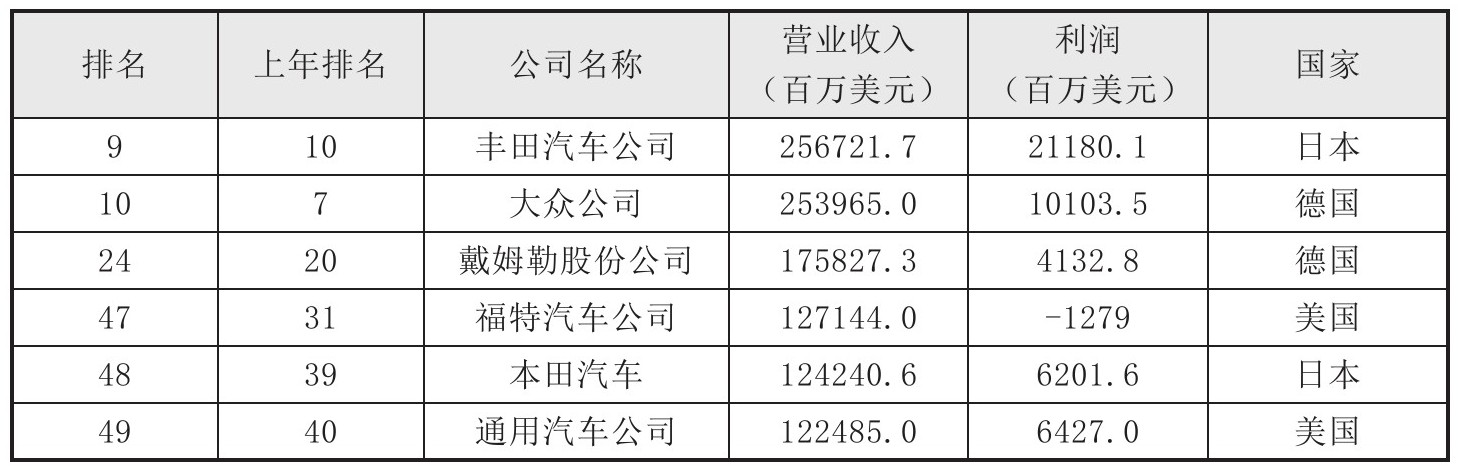 表1-1 2021年《财富》世界500强汽车与汽车零部件制造公司排行