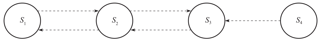 图2-1由4个状态和5个转换关系组成。根据安全策略的定义,可以将这些状态分为两个集合,一个集合 A 1 ={ S 2 , S 3 }为授权的状态集合,另一个集合 A 2 ={ S 1 , S 4 }为未授权的状态集合。图2-1中所示的系统是不安全的,因为由任意一个安全的状态出发都会达到一个不安全的状态。如果将 S 2 到 S 1 的边删除,该系统就满足了安全系统的要求。