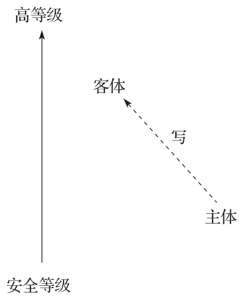 如果一个较高密级的主体在自己的权限范围内将较高密级的机密信息复制到较低密级的文件中,那么无形中就降低了该机密信息的安全密级,使得原本没有资格获取该信息的主体可以读取到机密信息的内容,从而破坏了信息的保密性。为了防止这种情况发生,就需要遵守*-属性,简称为“不向下写”。图2-3说明了BLP模型中的主体“不向下写”这一重要原则。当主体不能向比自己等级低的文件中进行写操作时,以上情况就不会发生。这一条件明确地表明具有高安全密级的主体不能发送消息给较低安全密级的主体。