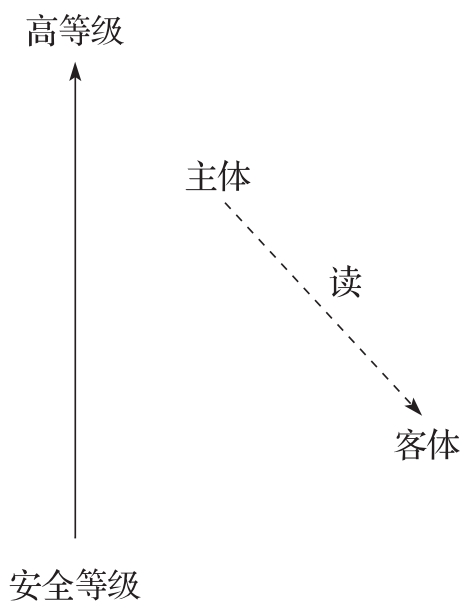 这一条件使系统中的主体不可能读到安全密级更高的客体,这样就可以保证机密等级高的信息不会流向较低的等级,简称为“不向上读”。图2-2说明了BLP模型中的主体“不向上读”的这一重要原则。这一安全条件不足以防止较高安全密级的信息客体泄露给较低安全密级的主体。因此,保密性模型必须同时满足下面的第二个条件,也称为*-属性。