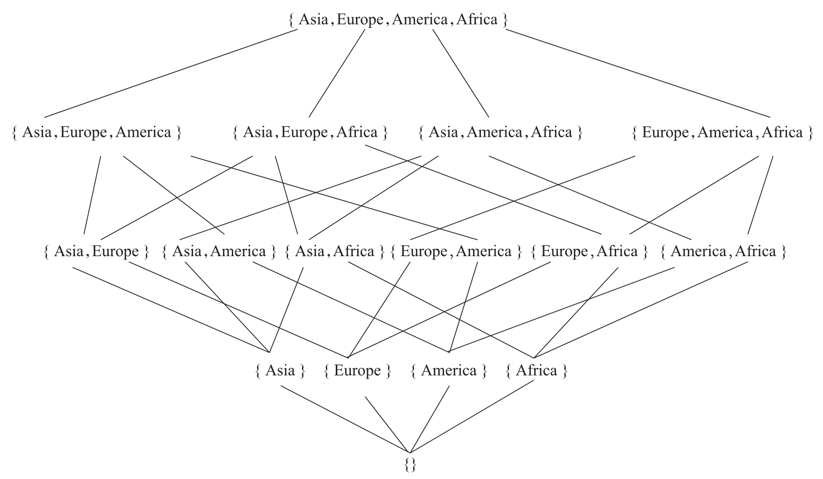 例2-2 系统中可访问的客体类别共有四个,分别是Asia、Europe、America和Africa。那么某个主体可访问的类别集合就是下列集合之一:空集,{Asia},{Europe},{America},{Africa},{Asia,Europe},{Asia,America},{Asia,Africa},{Europe,America},{Eu-rope,Africa},{America,Africa},{Asia,Europe,America},{Asia,Europe,Africa},{Asia,America,Africa},{Europe,America,Africa},{Asia,Europe,America,Africa}。这些类别集合在操作(子集关系)下形成一个格(如图2-4所示),其中,图中的连线表示符号“⊆”的关系。