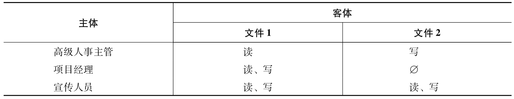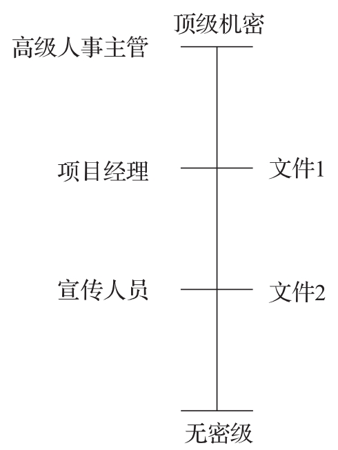 例2-3 用BLP策略模型中的强制访问控制关系和自主访问控制关系来判断主体与客体之间的关系,只有同时满足这两类访问控制关系的访问权限才是合法的。利用表2-1中实体安全等级的状态,假设一个信息系统中有三个访问主体,分别是高级人事主管、项目经理和宣传人员,有两个文件,分别是文件1和文件2,安全密级分别是:高级人事主管-顶级机密级、项目经理-机密级、宣传人员-秘密级、文件1-机密级、文件2-秘密级(强制访问控制关系如图2-5所示)。现在系统赋予这些主体一些访问权限(自主访问控制关系如表2-2所示)。根据BLP策略模型依次判断下列访问权限是否合法:高级人事主管对文件1的读权限;高级人事主管对文件2的写权限;项目经理对文件2的读权限;项目经理对文件2的写权限;宣传人员对文件1的读权限。