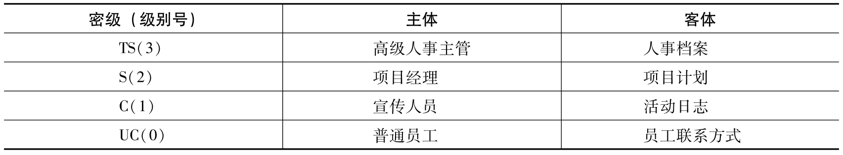 这里仍然用 s 表示信息系统中的主体,如进程,用 o 表示信息系统中的客体,如数据和文件。主体 s 可以对客体 o 进行r(读)、w(写)、a(添加)、e(执行)、c(控制)等几种形式的访问。用 l 表示安全等级, l ( s )表示主体 s 的安全密级, l ( o )表示客体 o 的安全密级,不同的安全密级由 l i 来表示, i =0,1,…, k -1,且 l i ≤ l i +1 。表2-1是该分类系统的一个实例描述。