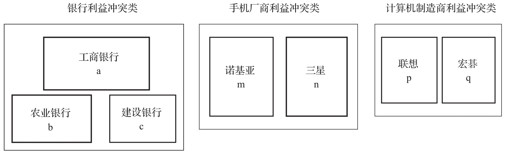 例2-8 CW模型中规定,每个数据客体唯一对应一个客体集合,每个客体集合也唯一对应一个利益冲突类,但一个利益冲突类可以包含多个客体集合。例如,一家咨询公司可以接受多个领域中的若干公司作为客户,包括银行(工商银行、农业银行、建设银行)、手机厂商(诺基亚、三星)、计算机制造商(联想、宏碁),需要将这些公司的数据分类储存。以上公司数据根据CW模型可以分为7个客体集合、3个利益冲突类,分别为{工商银行,农业银行,建设银行}、{诺基亚,三星}、{联想,宏碁},如图2-10所示。