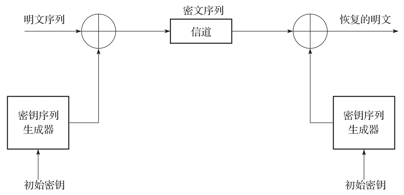 流密码又称序列密码,是对称密码学中的重要体制之一,它的起源可以追溯到20世纪20年代的Vernam密码。Vernam密码简单且易于实现,Vernam密码的关键是生成随机的密钥序列。设 M = K = C ={0,1},并且