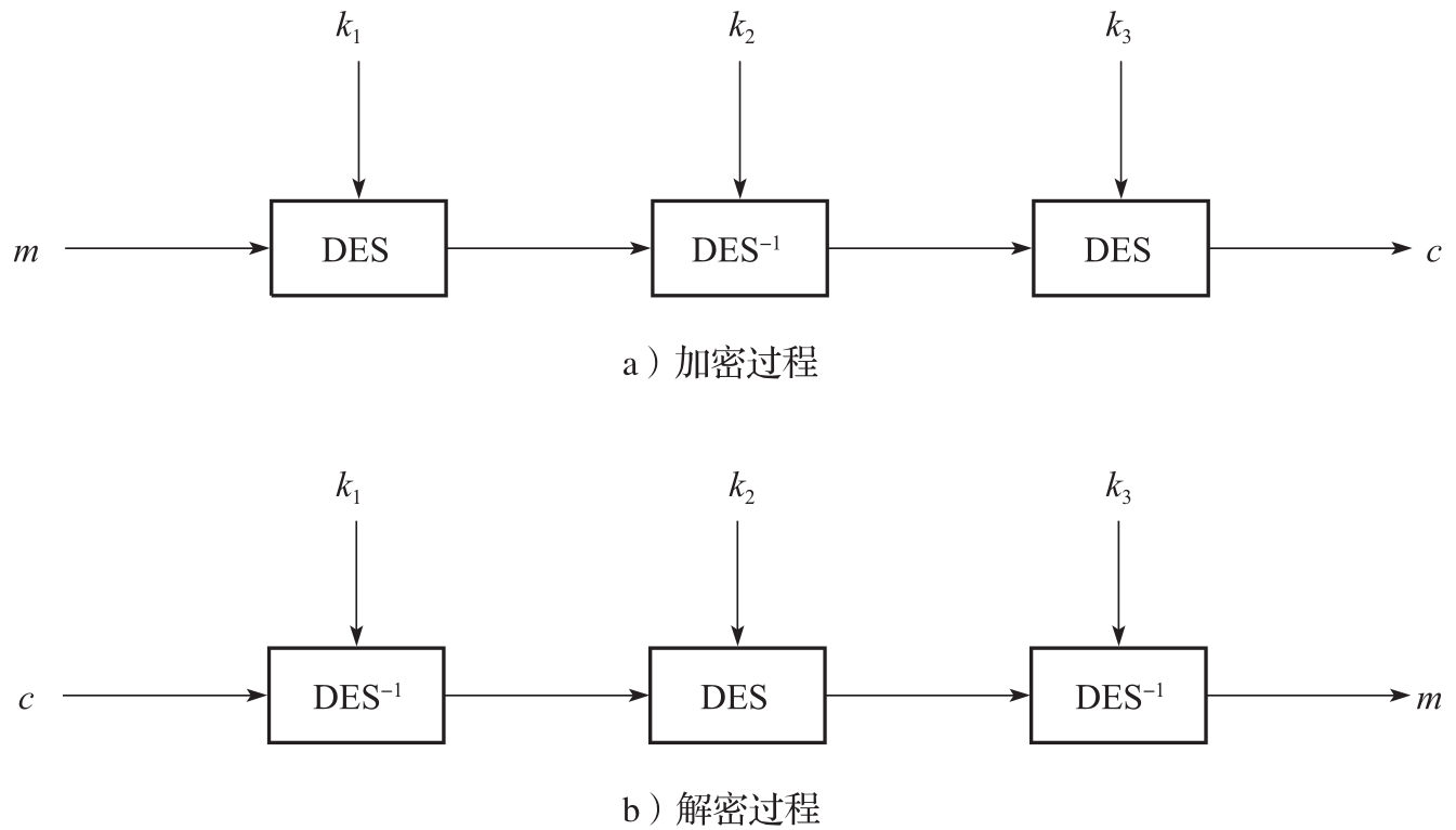 三重DES(记为3DES)加密算法是一种改进的DES算法,它使用3组密钥 k 1 、 k 2 和 k 3 对同一组明文进行多重加密(如图3-7所示),密钥长度为168比特(即56比特×3)。