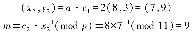加密:Alice要将明文 m =9( m ∈ F 11 )加密传送给Bob,Alice随机选取 k =3,并计算