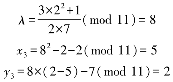 为了求得椭圆曲线 E 上的点 E 11 (1,6),取 P =(2,7),计算