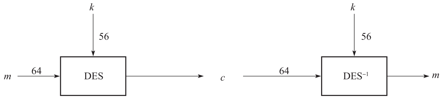 DES处理 n =64比特的明文分组并产生64比特的密文分组(如图3-5所示)。密钥的有效长度为56比特,更准确地说,输入密钥为64比特,其中8比特(8,16,…,64)可用作校验位。